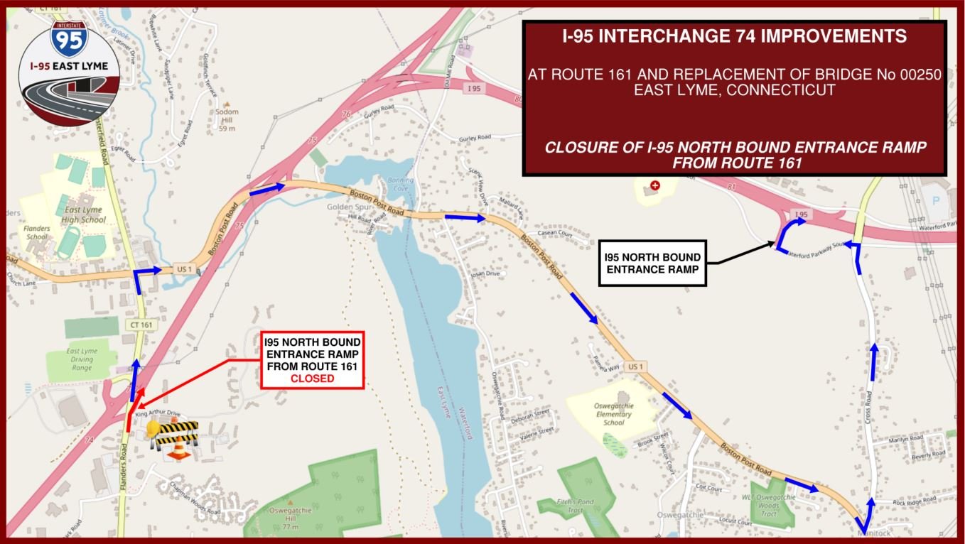 Continue on I-95 northbound, take Exit 81, turn left onto Waterford Parkway, turn left onto Cross Road, turn left onto Parkway North, turn onto I-95 southbound entrance ramp and take Exit 74 to access Route 161.